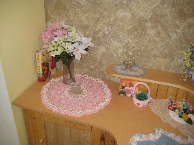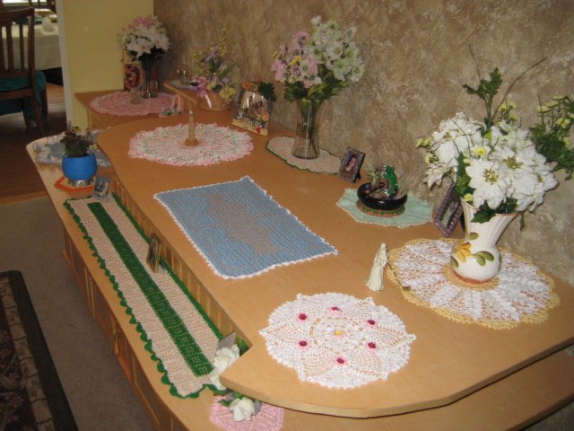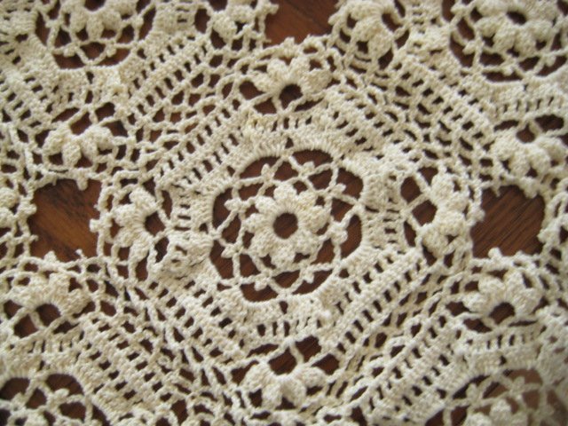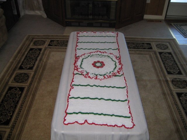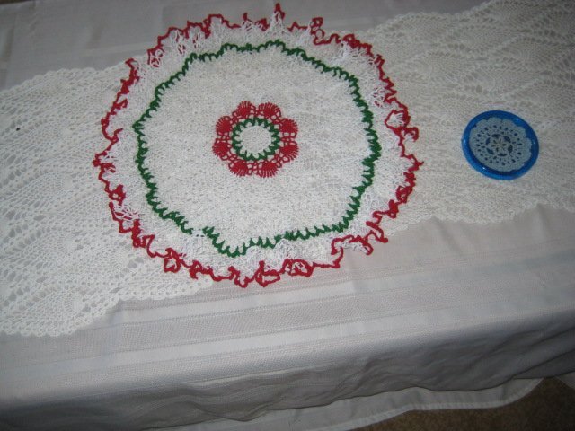 Christmas doilie atop a table runner both by Cathy.